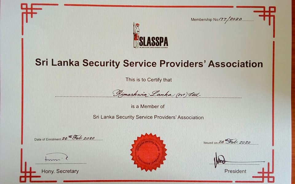 The Rimarkwin Lanka Security Solutions is a member of the Sri Lanka Security Service providers' Association (SLASSPA).